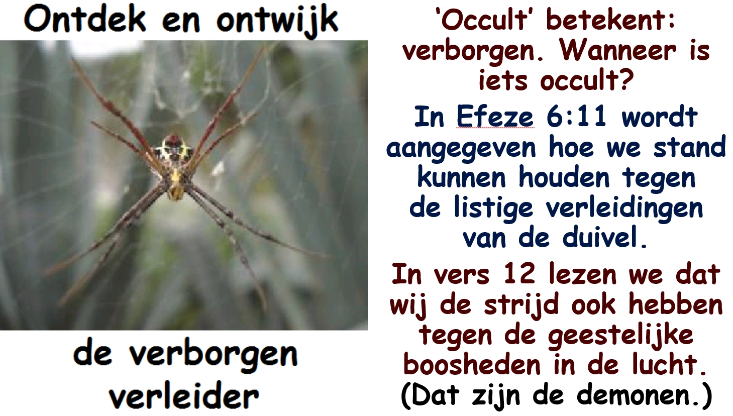 DJK : Pastor Derek Prince geeft een bijzonder mooie eenvoudig uitleg van hoe satan en zijn trawanten op verborgen geestelijke wijze werken, en hoe u bijvoorbeeld iemand kunt herkennen die zijn werken doet of onder zijn beïnvloeding staat, misschien wel zonder dit zelf te beseffen, middels misleiding, bedrog, manipulatie, intimidatie en dominantie, om zijn medemens in zijn macht te krijgen, zijn wil op te leggen en te laten doen wat hij wil, en vervolgens geheel te kunnen controleren. Kort samengevat, het geeft aan hoe satan door zijn verdorven demonische geesten middels valse onbijbelse leringen, afgoderijen, hekserijen, venijngeving, getwist, leugens en halve waarheden, het liefst hele volkeren onder een heerschappij van slavernij en dienstbaarheid wil brengen en houden. Luister goed, probeer op te merken, en maak een toepassing naar de tijd waarin wij nu leven met de dingen die op ons afkomen, en u zult bemerken van hoedanig satanisch de hedendaagse tijdgeest is geworden. Wees niet bang, er komen termen zoals ‘de aard en handelsmerken van hekserij’ naar voren, echter zonder vertoning van filmpjes over dit onderwerp.